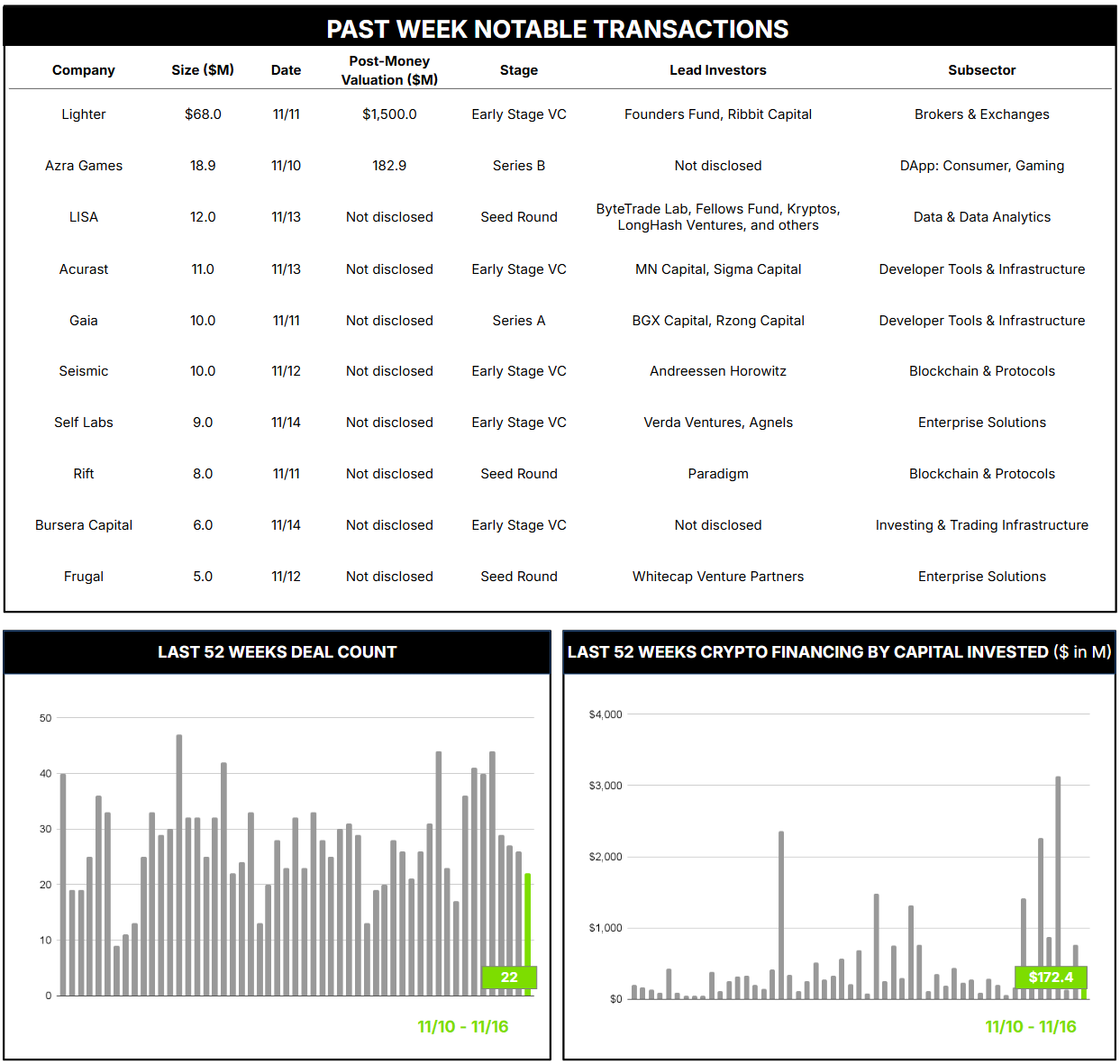 Looking at the numbers above, both deal count and announced capital raised dropped significantly last week. Some may think this is a function of the recent tumble in crypto prices (BTC is down roughly 30 percent from its 2025 high just six weeks ago). But note that these investments were greenlighted and negotiated weeks or months ago. It remains to be seen how deal activity and valuations will be affected in the next few months if crypto prices stay depressed. We have already heard of some deals being canceled due to market uncertainty, so stay tuned.