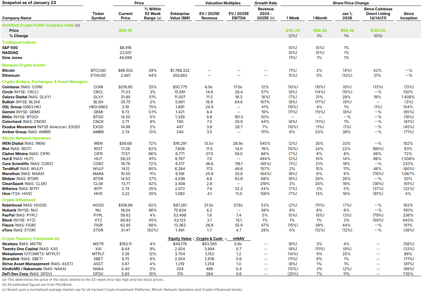 Initial trading saw a high of $23.14 (+29%), but since then, the stock has fallen to $14.50 (-19% from IPO price). Gemini followed a similar pattern. It priced above its market range ($28 per share vs. $24 – $26 per share), and after an initial 2-day pop, declined before stabilizing at the initial price range. It is hard to forecast BitGo’s near-term move, but a reasonable scenario is it also stabilizes around its initial pricing range. In the end, there is a lesson for the underwriting team. Underwriters have to balance maximizing issuer proceeds with early trading optics, and in a less frothy market they should put more weight on the optics, even if it means leaving a bit more upside for aftermarket.