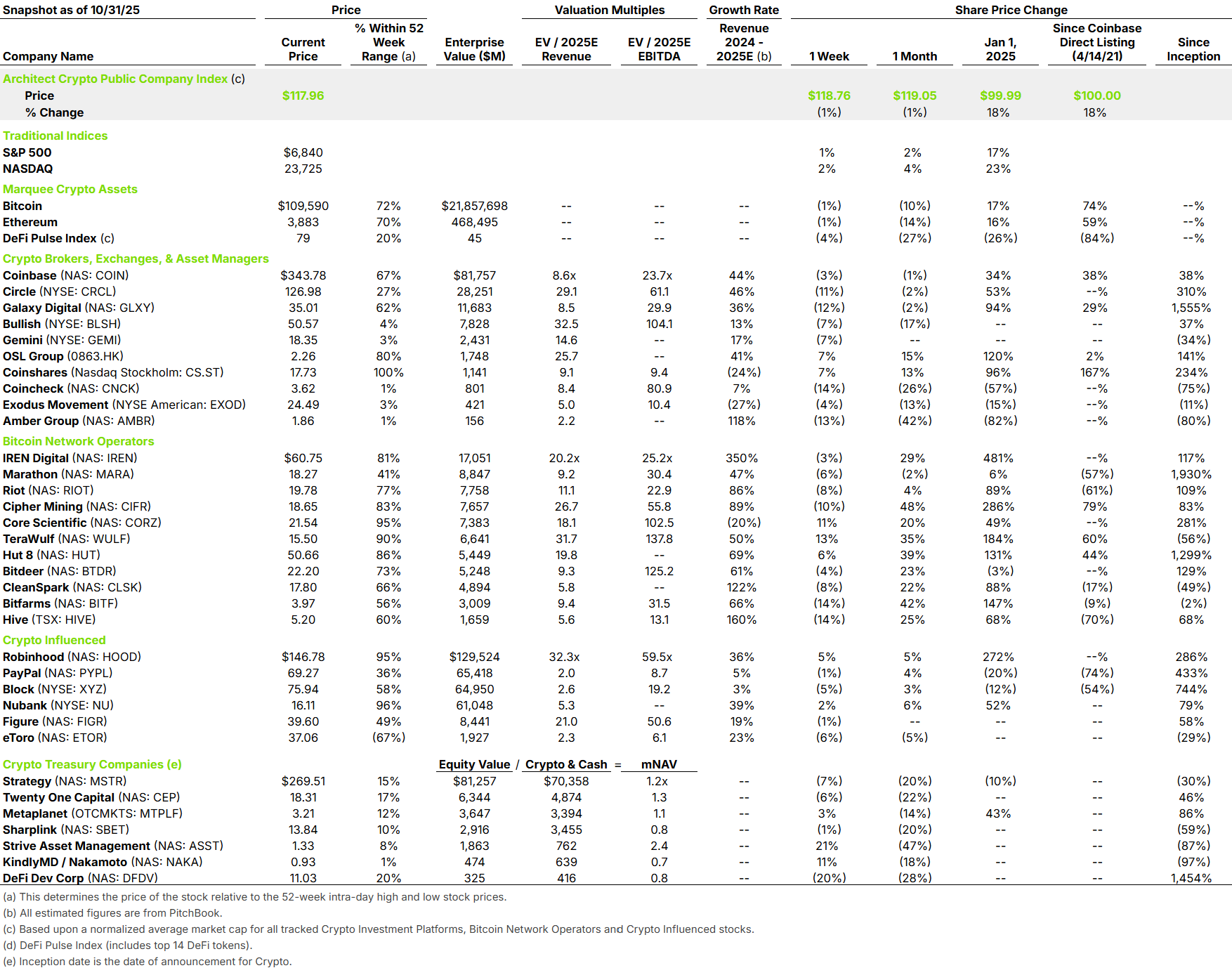 This past week earnings season began with Coinbase, Core Scientific and others making waves. Coinbase’s Q3 2025 was a major success. Revenue was $1.9B (+25% QoQ, +55% YoY), split between $1.0B in transactions (+37% QoQ) and $746.7M in subscriptions and services (+14% QoQ, +34% YoY). Adjusted EBITDA was $801M (+57% QoQ, +78% YoY). Trading volume reached $295B (+24% QoQ) and assets on platform were $516B.