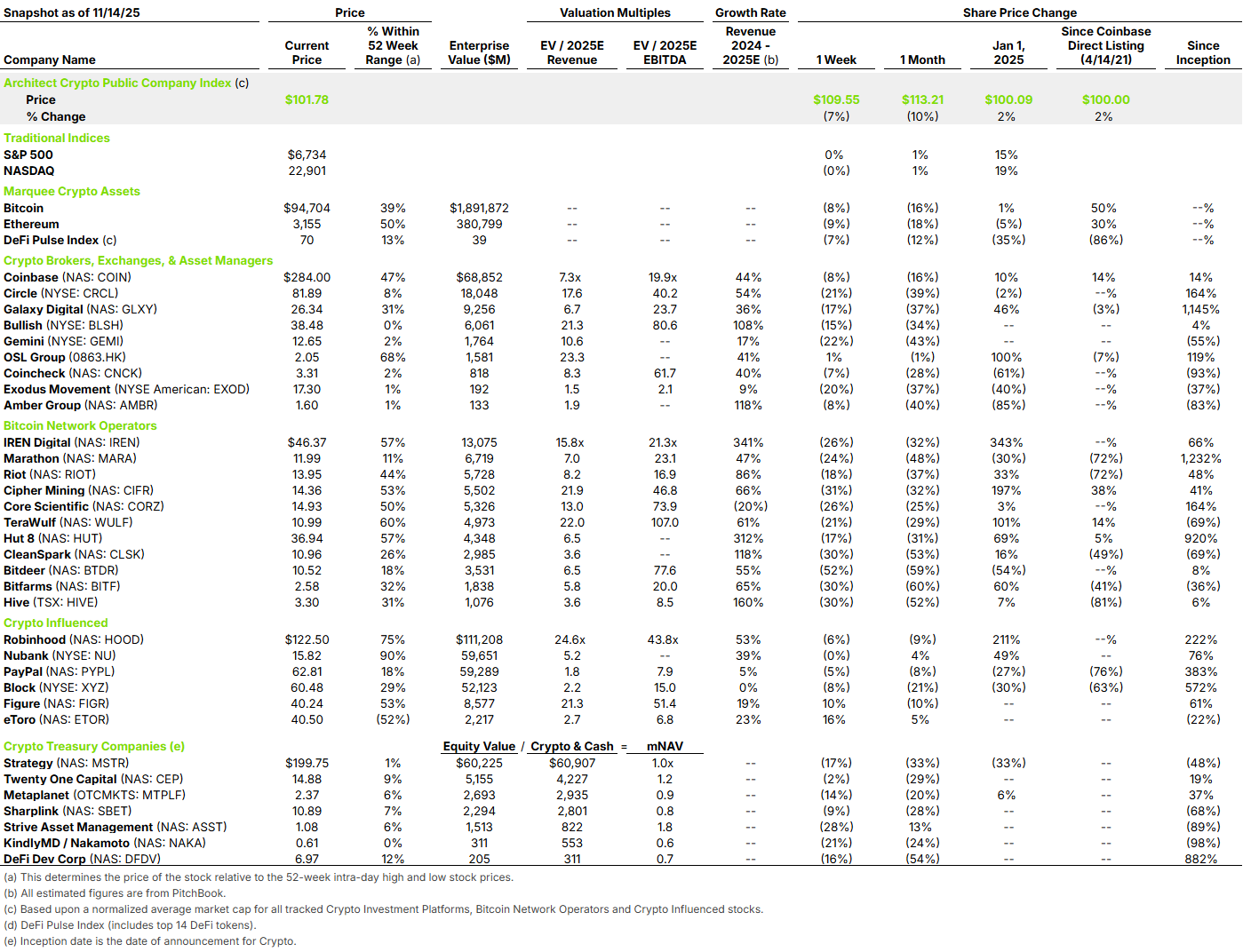 Over the last week and month, BTC has declined by 8% and 16%. At the same time, several companies announced that they outperformed expectations and grew at significant rates, including Coinbase and 14 other companies in our tracker, which grew revenue by 20% or more quarter-over-quarter. Despite that, our Crypto Brokers, Exchanges & Asset Managers declining 31% and 13% in the last month and week, and the miners declined 42% and 28% respectively.